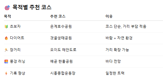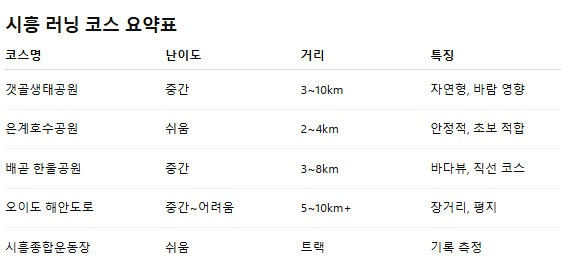 가볍게 시작하고 싶은 날에는 은계호수공원처럼 안정적인 코스를 선택하고, 기분 전환이 필요할 때는 배곧이나 오이도처럼 시야가 탁 트인 곳을 달려보는 것도 좋은 방법이 아닐까 싶습니다.